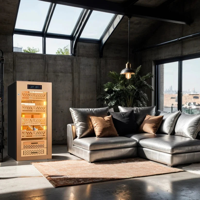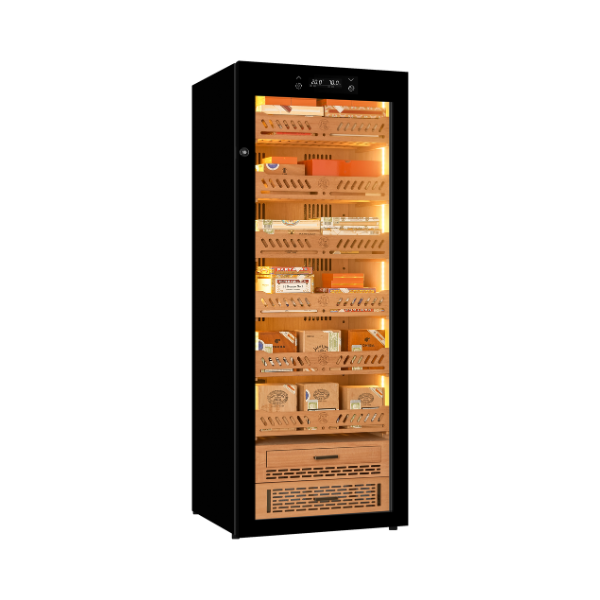 A refined fusion of cutting-edge technology and timeless elegance. Designed for serious collectors, it holds up to 1700 cigars and features a powerful Embraco compressor and Nanoe™ ammonia removal system for ideal preservation. With precise temperature and humidity controls, Spanish cedar shelving, soft LED lighting, and a secure glass door with LCD display and locking system, this humidor is more than storage — it's a statement piece. Perfect for a luxury den, office, or cigar lounge, it transforms your collection into a sophisticated showcase.